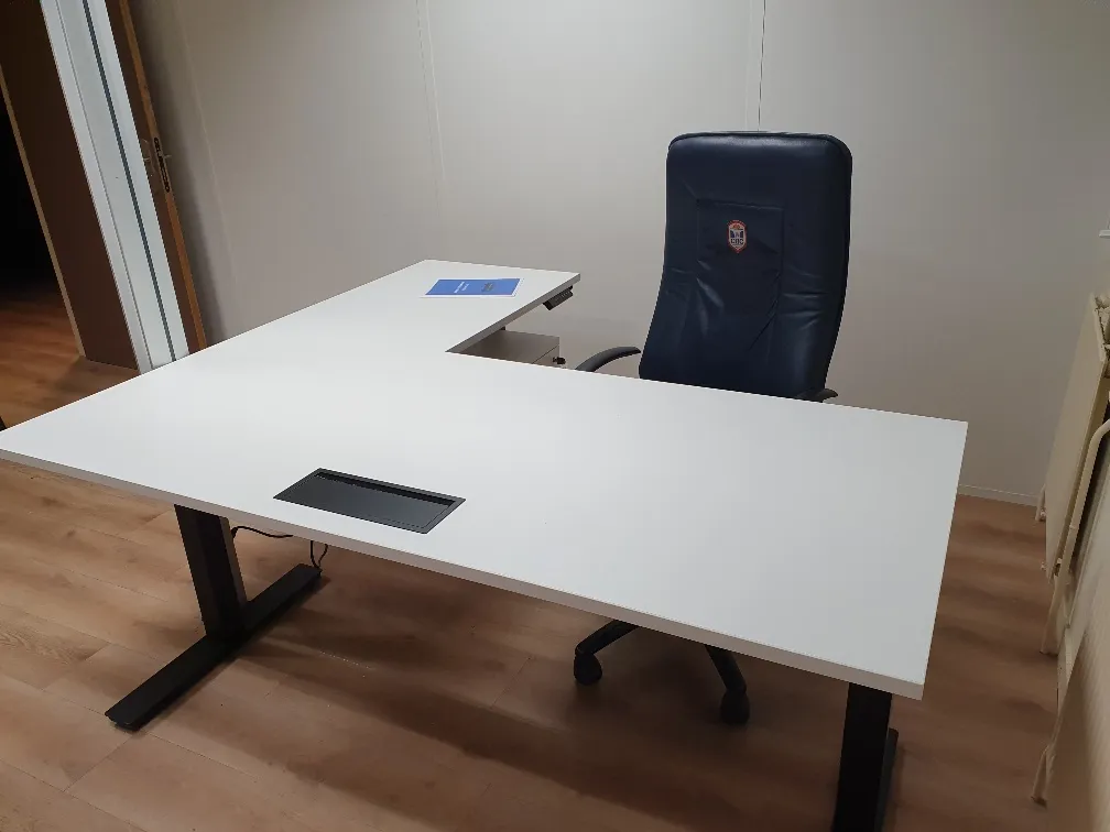 Nous avons équipé ce bureau réglable en hauteur, électrique à commande & mémoire digitale Envol One Evo de Buronomic (Aluminium-Chene-Fil)